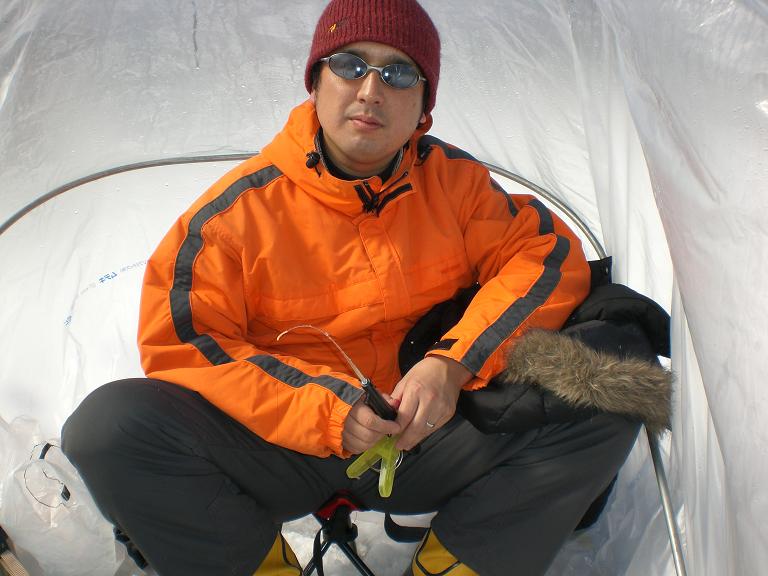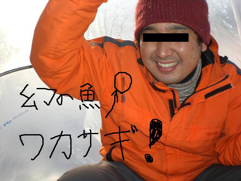 テントの外では、釣れたー!の声が時々聞こえるから、ワカサギは実際に泳いでるらしいし、ココラ辺りに居るらしい。
