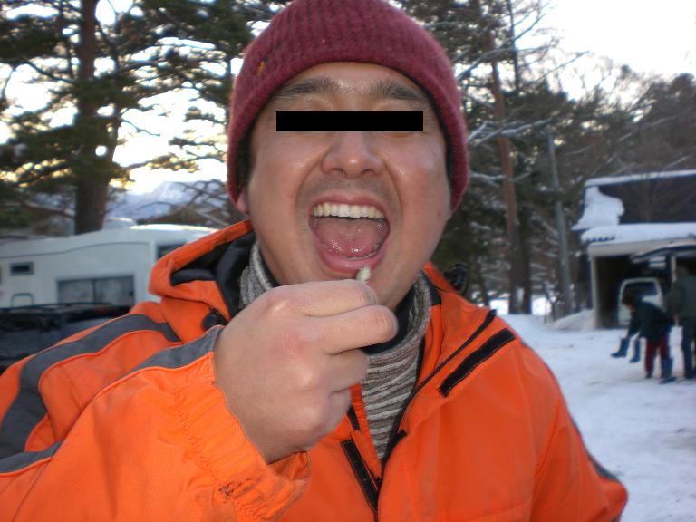 昼、ま、コレも一度はやってみたかった、氷上でお湯を沸かし、カップヌードルを食べる。
